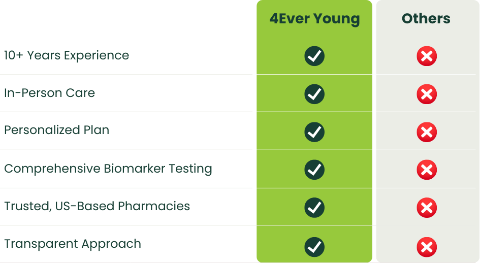 We're the gold standard in Testosterone Replacement Therapy. Our approach includes: 70+ biomarker comprehensive testing, personalized treatment protocols, monthly monitoring and accessible medical support. Plus, we offer multiple delivery methods (injections, creams, pellets) tailored to your lifestyle.